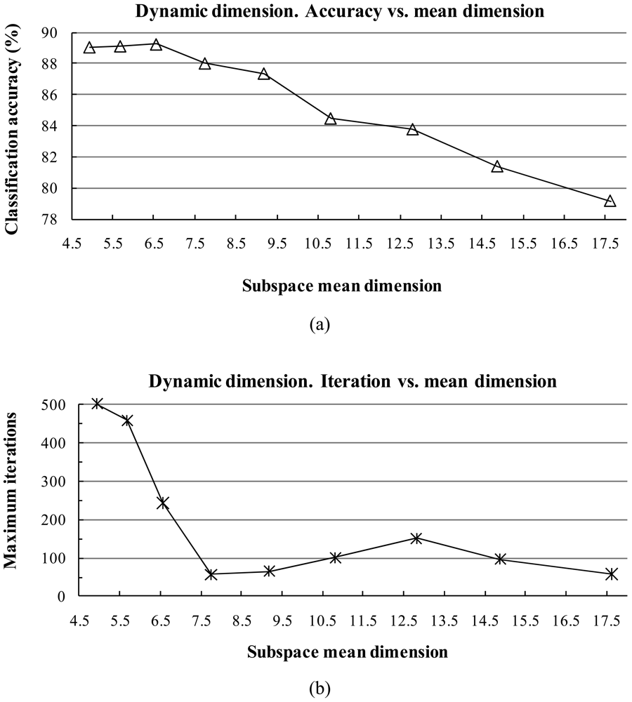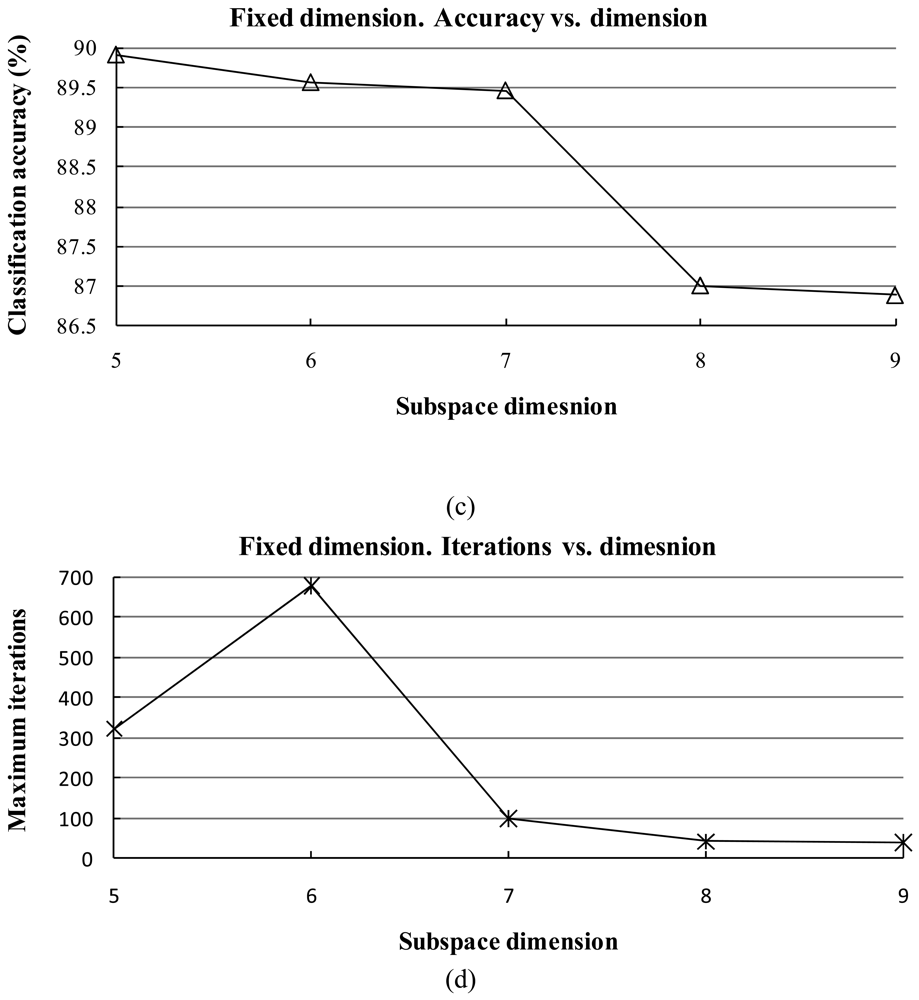 Similar behavior was also apparent in the fixed subspace method. Figures 1(c) and (d) show that the classification accuracy tended to decrease when the number of dimensions increased. However, there were fewer maximum training iterations when the dimension number increased. The best classification accuracy obtained was 89.91% with the dimension number fixed at 5, which is 0.66% better than the dynamic subspace method.