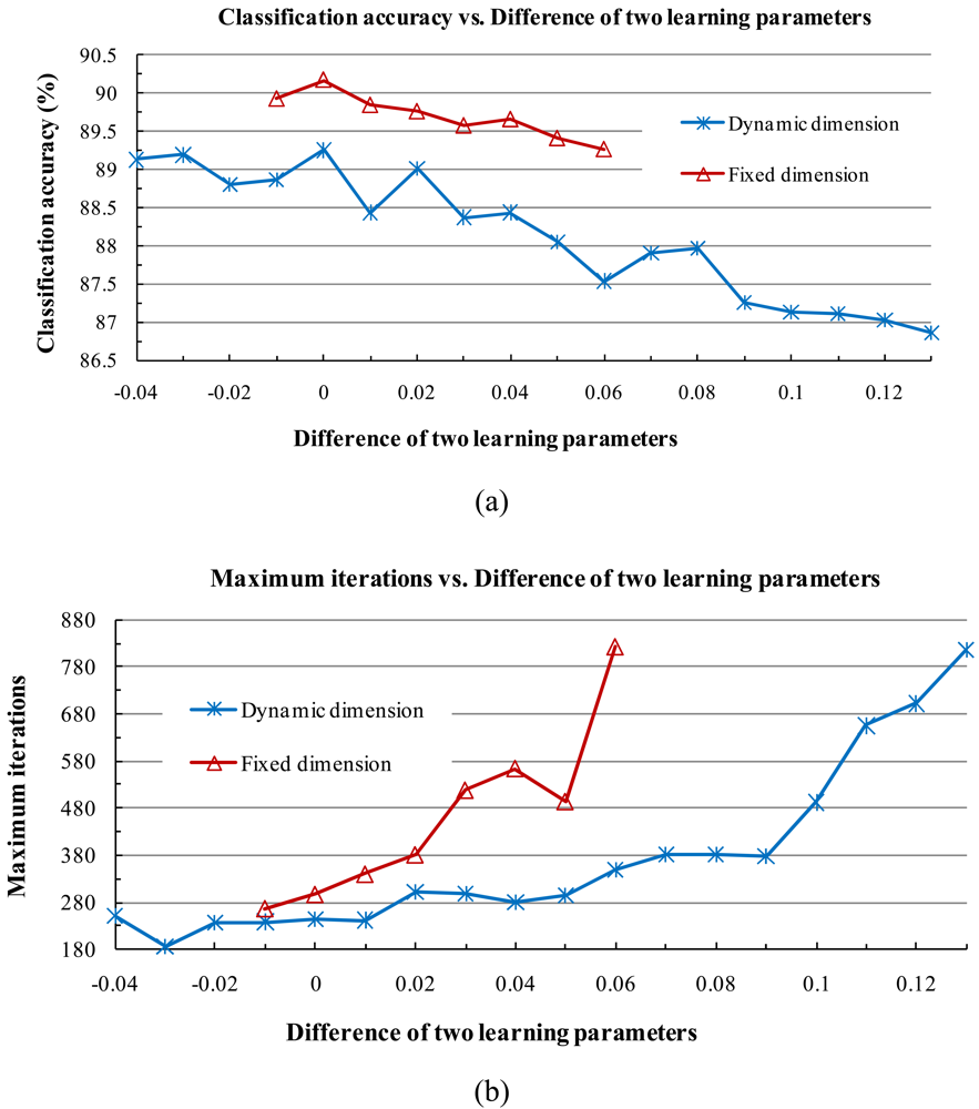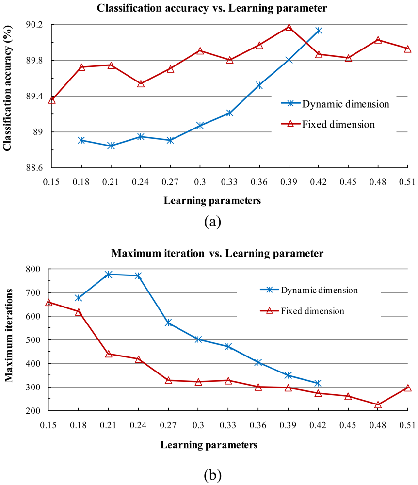 In the dynamic subspace method, the fidelity value was fixed at 0.99985 and the corresponding convergence interval of learning parameters was [0.18, 0.42], implies the two learning parameters were set to the same constant value within [0.18, 0.42]. In the fixed subspace method, the number of dimensions was fixed at 5 and the corresponding convergence interval of learning parameters was [0.15, 0.51]. As shown in Figure 2, the classification accuracy increased stably and the training iterations rapidly lowered when we increased the parameter value in steps of 0.03 in both the dynamic and fixed subspace methods.