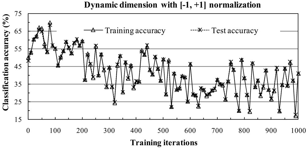 From the results shown in Figure 1 based on the [-1,+1] normalization method, fixed subspace methods generally yield better classification accuracy than corresponding dynamic subspace methods (89.91% vs. 89.25%).