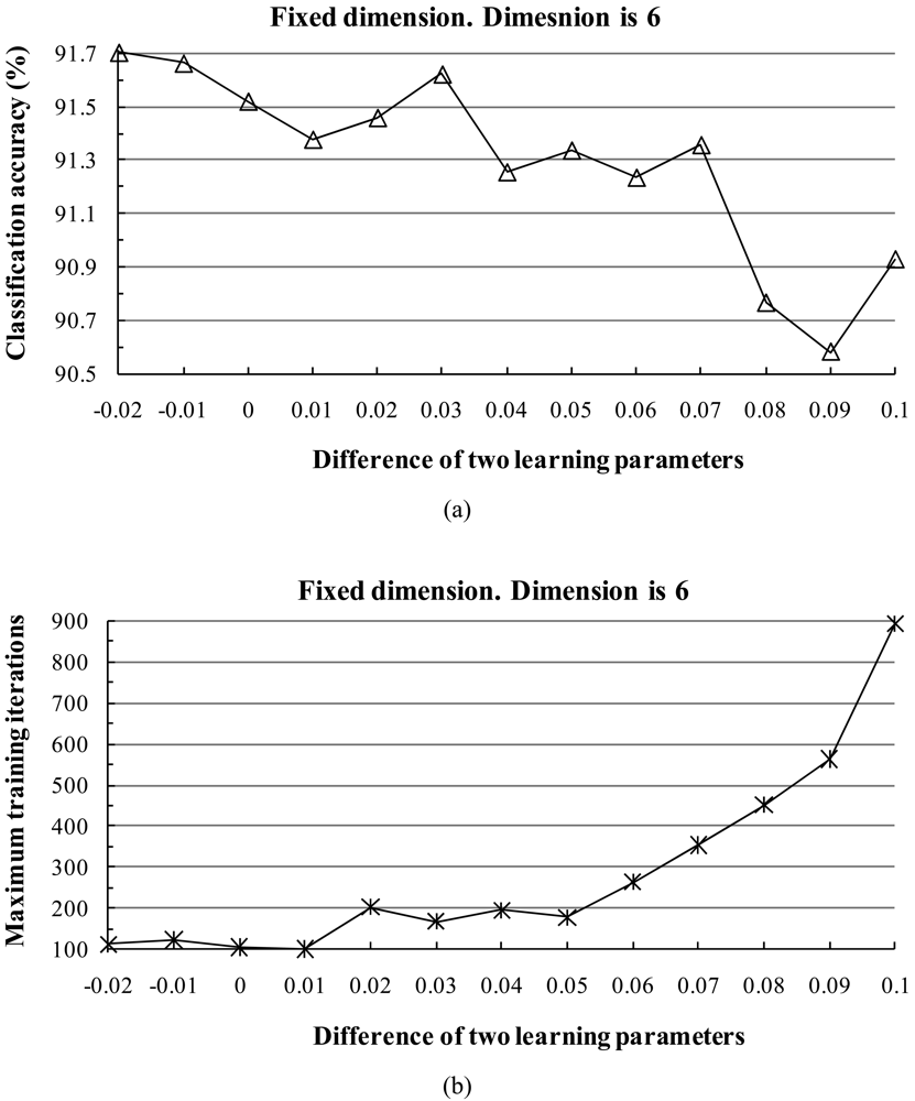 First, we examined the behavior of the classification accuracy when the two learning parameters were set to different constant values. Similar to the behavior shown in Figure 3, when the two learning parameters were equal or close to each other, generally the classification accuracy was high and the training time was short. For example, Figure 5 shows the behavior of the classification accuracy and maximum training iterations when the fixed dimension was 6, the parameter α was kept to a constant value of 0.45, and the corresponding convergence interval of β was [0.35, 0.47]. Similar to Figure 3, we increased the value of the parameter β in steps of 0.01 (Figure 5). We found that when the two learning parameters got closer in value or were equal, the classification accuracy increased and our method converged relatively fast and effectively. Otherwise, the classification accuracy decreased or the training samples did not converge.