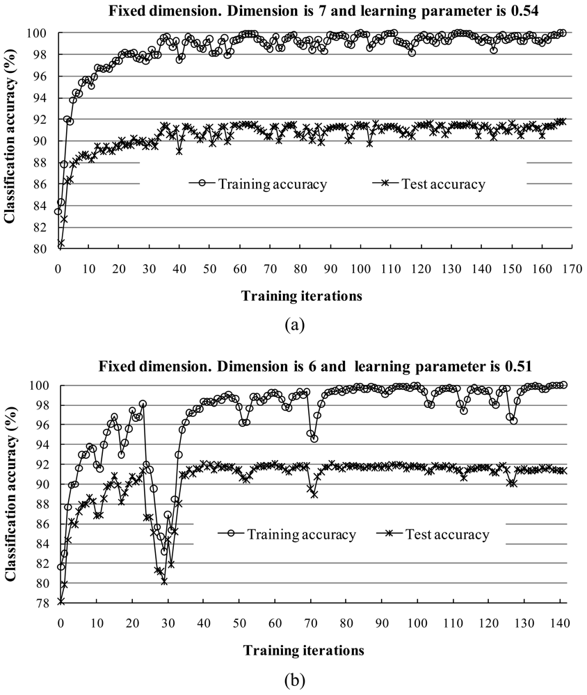 Plots of the accuracy rate vs. the number of iterations for the training and test samples. (a) Dimension of 7 with the learning parameter 0.54; the best test data accuracy of 91.79% was reached when the training iterations completed (at 167). (b) Dimension of 6 with the learning parameter 0.51; an accuracy of 91.34% was achieved when the training iteration completed (at 141). However, the best test data accuracy of 92.11% was reached at training iteration 76.