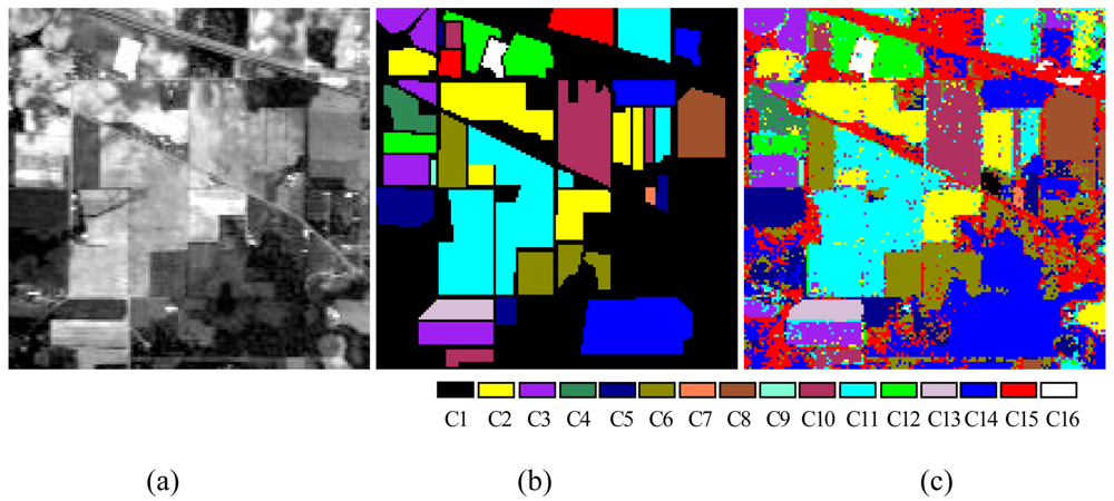 (a) Band 16 (central wavelength: 547.60 nm) of the AVIRIS Indian Pines data set and (b) ground truth. (c) Classification map obtained with the fixed subspace method combined with the [0, 1] normalization method. The subspace dimension was 7 and both learning parameters were 0.54. The overall classification accuracy was 91.79%.