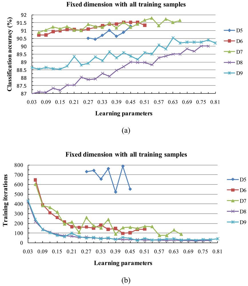 The five curves in Figure 8, show strongly similar stability in their convergence to 100% accuracy in a finite number of steps. However, smaller learning parameter values tended to need more time (iterations) to converge to 100% accuracy. The subspace dimension was not critical to the behavior of the classification accuracy among the values of 5, 6, or 7 [Figure 8(a)], but the smaller dimensions tended to require more training time [Figure 8(b)]. The classification accuracy increased for large values of the learning parameters.