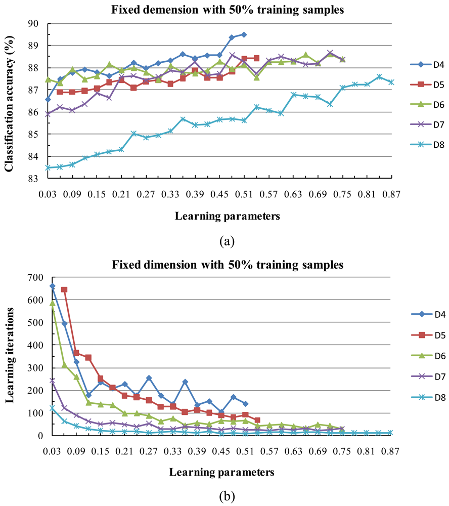 Figure 9 shows how the subspace dimension and learning parameters influence classification accuracy and maximum training iterations. The training iterations and learning parameters in Figure 9 are the same as those in the previous study (e.g., Figure 8) but we varied the dimension from 4 to 8 in this case because of the small number of training sets and because the classification accuracy decreases rapidly with dimensions less than 4 or larger than 8.