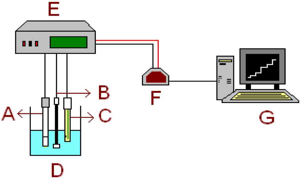 Measurement system used. A: Sulpiride selective electrode; B: Stirrer; C: Reference electrode; D: Sample; E: Potentiometer; F: Analogue-to-digital converter; G: Personal computer.