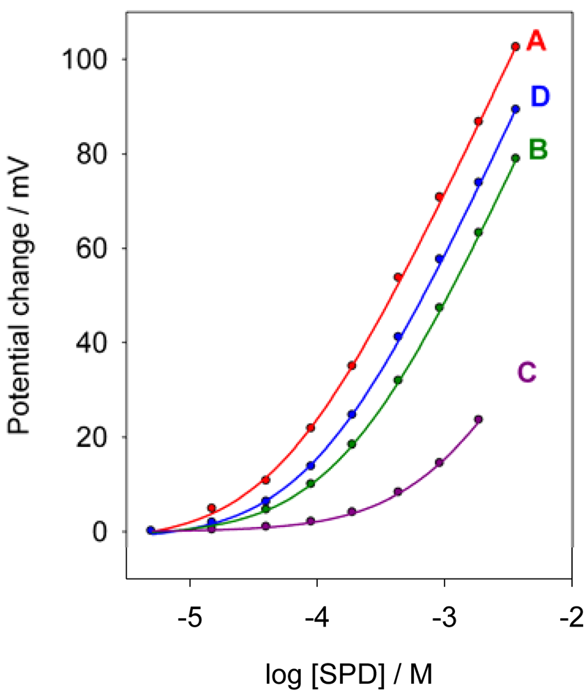 The selectivity of an ion-pair based membrane electrode depends on the physico-chemical characteristics of the ion-exchange process at the membrane-sample solution interface, on the mobility of the respective ions in the membrane and on the hydrophobic interactions between the ions and the organic membrane []. The selectivity of the SPD membrane electrode is related to the free energy of transfer of the SPD cation between aqueous and organic phases.