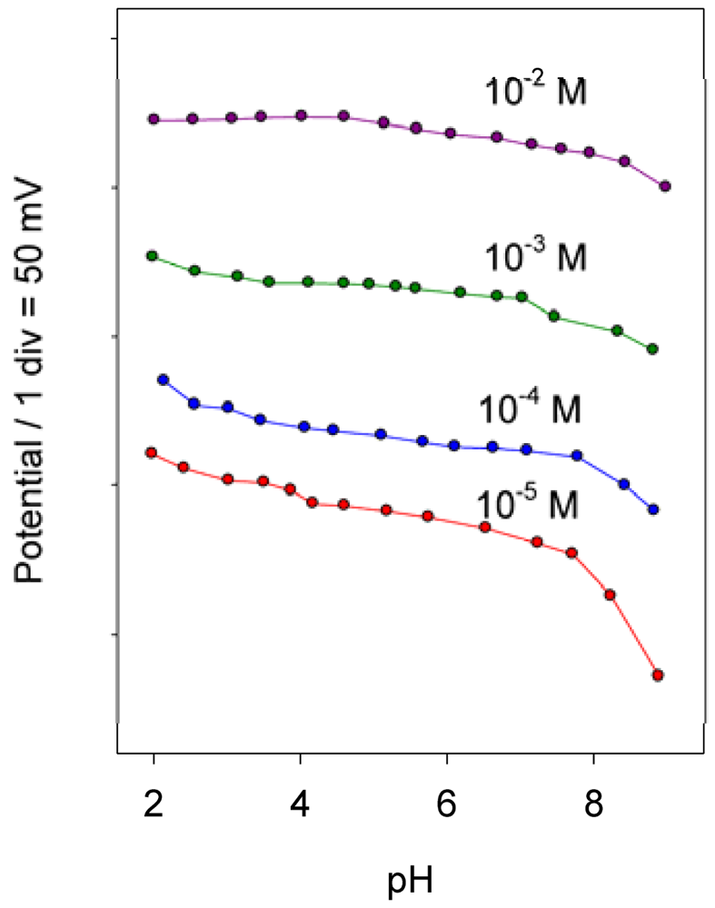 The effect of pH on the electrode potential at various sulpiride concentration in the range 1 × 10-5 – 1 × 10-2 M was studied. The pH was varied by adding HCl or NaOH, and the results obtained are shown in Figure 4. As can be seen, the electrode potential was little influenced by pH in the range 2-8 for sulpiride concentrations between 10-2 – 10-4 M. At higher pH values, the potential decreased due to the gradual increase in the concentration of the deprotonated form of the SPD (pK1 = 8.9). In working with ion-selective electrodes for cationic drugs, we have observed some problems of precipitation of at high concentrations of the drug and higher pH values. A pH of 4.7 adjusted with 2 × 10-1 M acetic/acetate buffer was used for further studies.