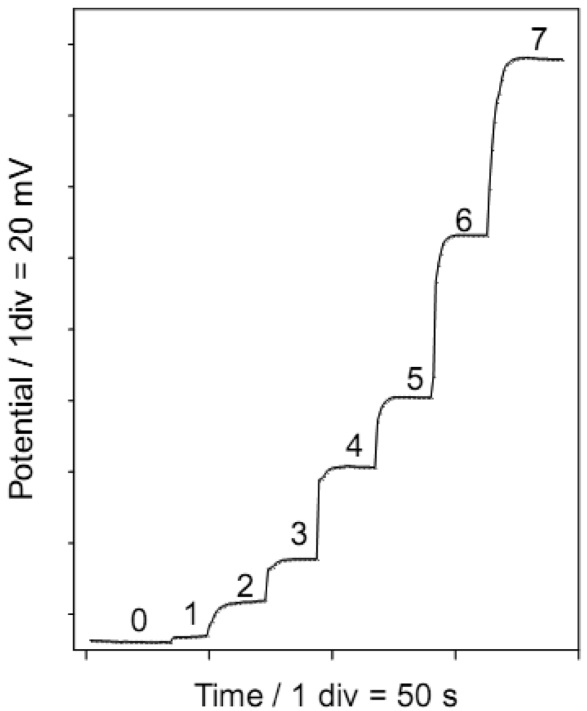 Dynamic response of electrode to different sulpiride concentrations. 0:0; 1:1 × 10-6 M; 2: 6 × 10-6 M; 3:1.6 × 10-5 M; 4: 6.6 × 10-5 M; 5: 1.6 × 10-4 M; 6: 1.1 × 10-3 M; 7: 9.1 × 10-3 M.
