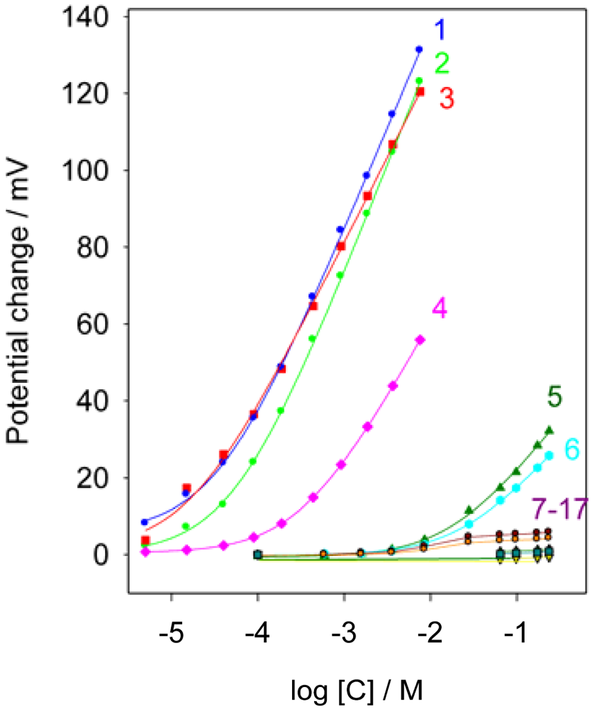 Calibration graph for sulpiride and interferent ions. Curves: 1 ranitidine; 2 sulpiride; 3 ofloxacine; 4 cimetidine; 5 K+; 6 NH4+; 7 – 17 Ca2+, Mg2+, glucose, lactose, sucrose, urea, uric acid, hipuric acid, amoxiciline, diclofenac and carbamazepine respectively.