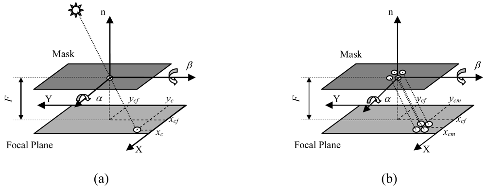 were tried, showing poor accuracy, especially for large sun-line off-boresight angles. Indeed, the geometrical model in Equation (3) does not take account of unavoidable misalignments of sensor components and, more in general, deviations from the design nominal configuration. In addition, only scarce improvements are achieved by using more complex geometrical models in which additional parameters are introduced to model the actual mask-FP geometry (i.e. focal length and component misalignments) estimated during sensor calibration by LSQ best fit. In fact, additional non-linear effects are present, due to mask thickness, manufacturing tolerances, diffraction effects, non-uniform response and finite size of photodetector pixels, which cannot be explicitly included in the model. Hence, in spite of the poor results, there would be a significant increase in the complexity of the model which impacts negatively both the calibration procedure and sensor operation.