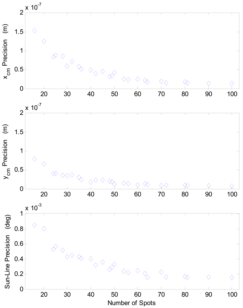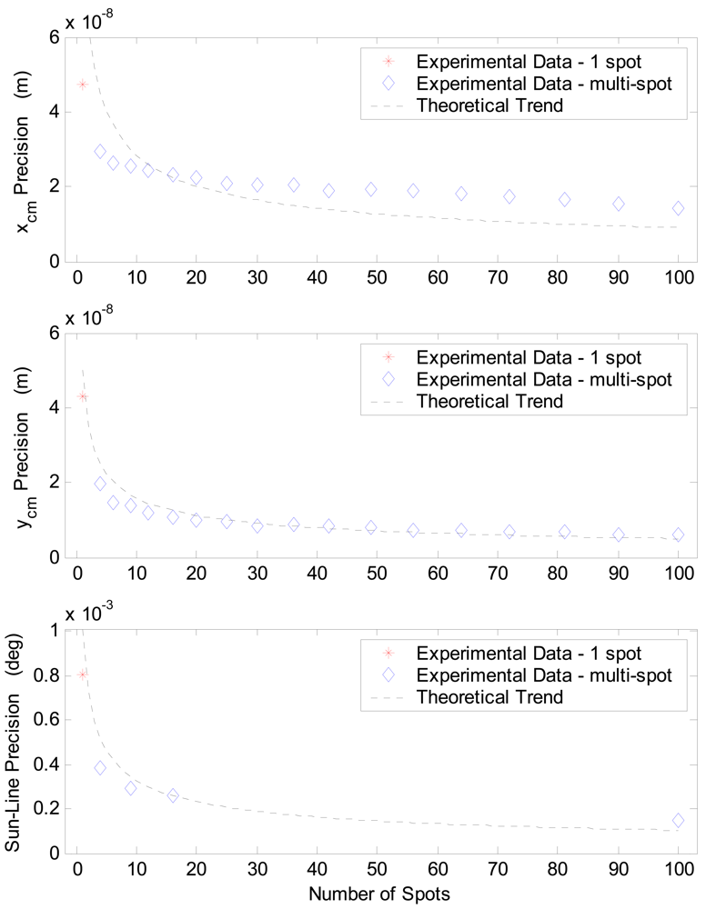 The beneficial effect of having multiple apertures, with respect to the case of one single aperture, can be clearly identified. Indeed, average precision is significantly improved (from about 0.001° to about 0.0002°); whilst, average accuracy, which is in the order of 0.01°, is not influenced. To highlight this effect, in Figure 8 average precision in terms of centroid and sun-line error is reported as a function of the number of simultaneously imaged spots and compared to the expected trend for uncorrelated, multiple measurements (Equation 1). A limited number of experimental data is reported for the sun line error due to the reduced number of calibration functions that were trained. As expected, a certain degree of correlation exists, which is more marked in xcm and in the sun line error. Hence, the achieved improvement, although fairly evident, is lower than the theoretical one.