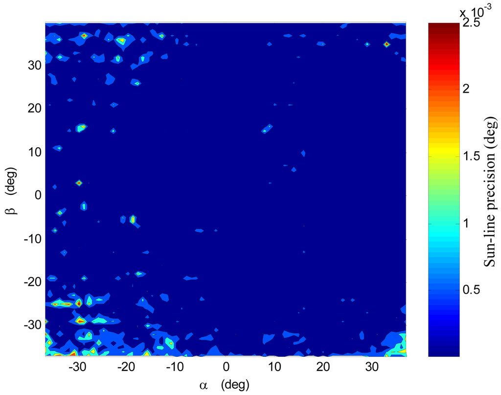 - finally, performance is evaluated by comparing the measured sun lines to the their TS known values. Errors are computed as the difference between the computed angles defining the sun-line orientation and the known angles of the sun simulator facility, accurately known thanks to the rotation stage feedback to the control workstation. Also, the angle between the computed sun line and the known one, referred to as sun line error in the following, is computed. It is a useful, synthetic figure of merit, being fully representative of measure performance.