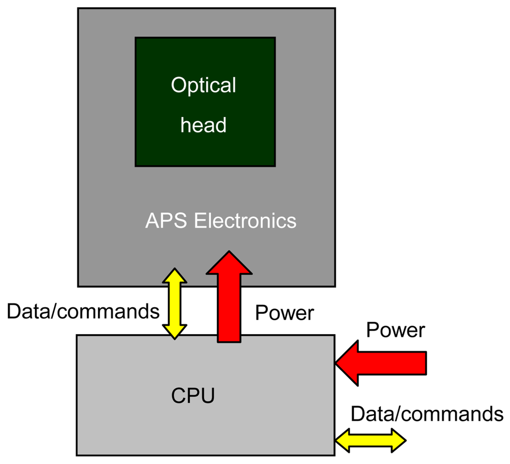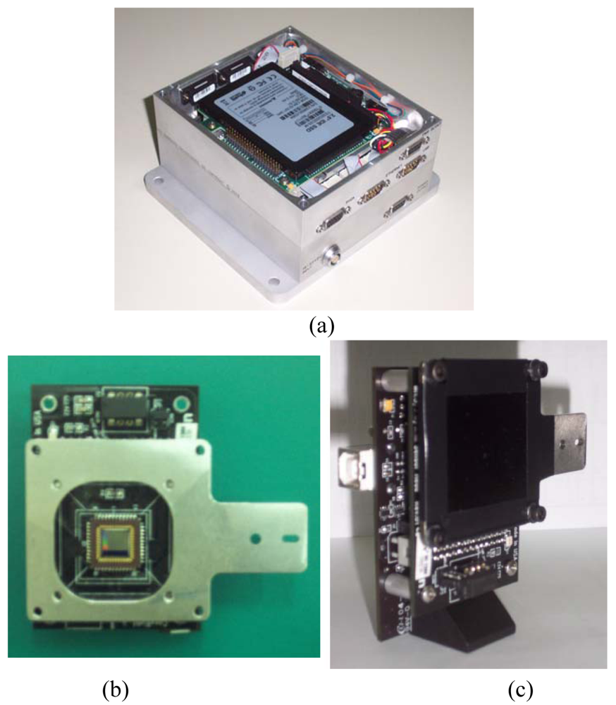 The OH includes the CMOS photodetector, the focal plane electronics and the mask. The photodetector is a two-dimensional CMOS Active Pixel Sensor (APS) produced by Micron Technology Inc.™. This unit includes a 10-bit ADC, programmable electronics for some basic camera functions (i.e. shutter time setting, windowing, row/column skipping), and part of the focal plane electronics. Focal plane electronics and I/O interface to the CPU are implemented in two commercial boards, also by Micron. The board containing the detector implements all the needed focal plane circuitry for detector control and image acquisition, whilst the other board operates conversion of the detector specific communication protocol to the USB 2.0 standard.
