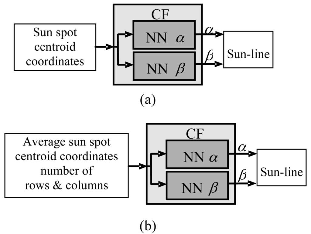 Neural-network-based CFs provide a viable and interesting alternative solution to achieve high accuracy without introducing very complex models. Indeed, Neural Networks (NNs) with supervised training are universal approximators, i.e., they can approximate to any desired degree of accuracy any real-valued, continuous function (or sufficiently regular function, with a countable number of discontinuities between two compact sets). Moreover, NNs, if non-linear w.r.t. their parameters, are also parsimonious, that is they implement the desired approximation using the lowest number of parameters [16,17]. Hence, they can be effectively exploited to build the CF, since they can implement the required mapping without any prior assumption about the centroid-to-sun-line transformation, by constructing the non-linear mapping on the basis of experimental data only.