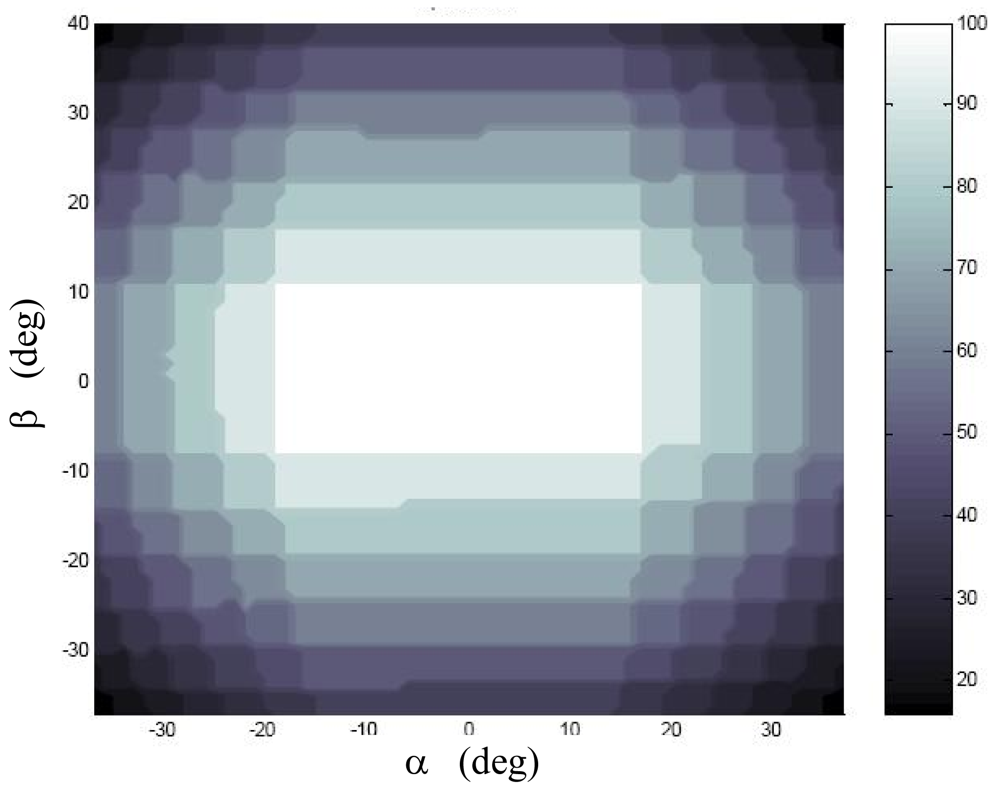 The above described X-FOV mode is implemented in the sensor prototype and tested on ground. To this aim, also an enhanced centroiding algorithm is developed. It computes the average centroid of a set of sun spots arranged in a two-dimensional array, assuming that the number of rows and columns can be variable. For the calibration function, the same neural structure of the S-FOV mode was maintained. However, the NN input stage is modified so to exploit also the imaged spot array size (i.e. row and columns) to map the average centroid into the illumination direction (see Figure 4b). In the X-FOV operating mode, the sensor gets a theoretical FOV larger than 80 × 70 [18]. Figure 5 shows the number of correctly imaged spots in the extended FOV, as obtained in laboratory tests.