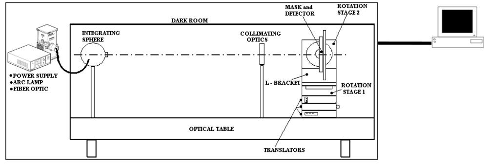 The test system consists of four main sections: radiation source, collimating optics, sensor micro-positioning subsystem, PC-based control terminal [10,11]. They also allow sensor-light source relative pointing control. These components are installed on an optical table for stable and precise alignment. A dark room set-up covers all the components to isolate them from external light sources and avoid internal reflections (see Figure 6).