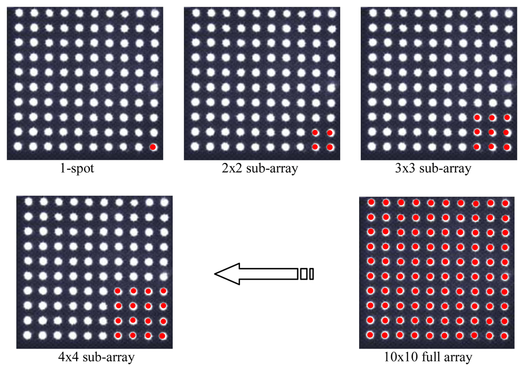 Objective of the first test campaign is the validation of the enhanced sensor concept, and the assessment of its performance with respect to the basic sensor configuration. Various multi-hole configurations (2 × 2, 3 × 3, 4 × 4, and 10 × 10 arrays) are considered for a thorough characterization of the enhanced sensor concept. To avoid construction of several mask prototypes, multiple acquisition campaigns, and generation of an enormous bulk of data, all the considered multi-hole configurations are evaluated by using the same data set acquired with the 100-hole mask, including the 1-hole case. In fact, fixed sub-arrays of the imaged spots in all the acquisitions of the campaign are selected according to the sequence of Figure 7 and dealt with as acquired alone. This procedure avoids comparing results of different campaigns, which could introduce undesired effects due to different operating conditions.