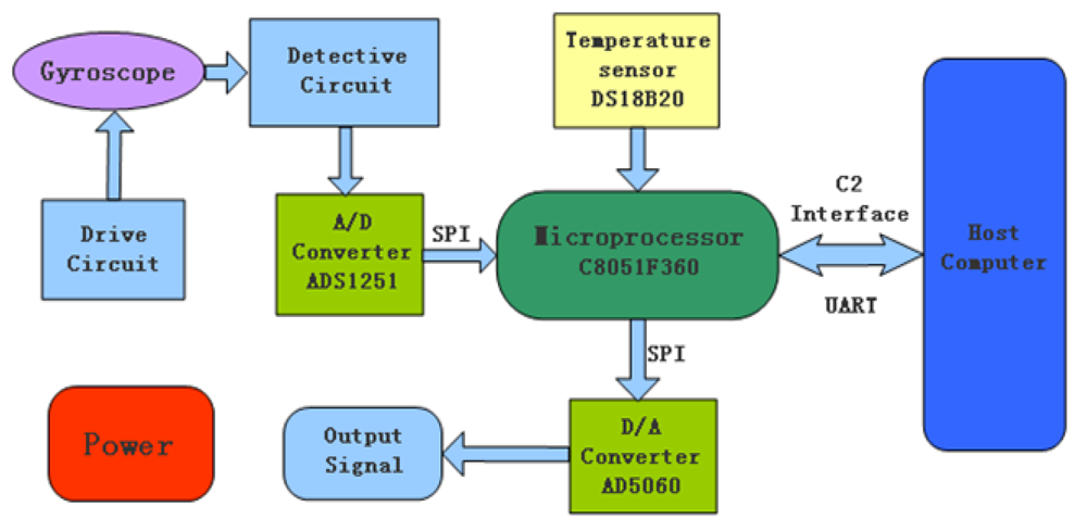 - According to the analog output requirement of the system, after converted by A/D and then compensated in the microprocessor, the compensated digital signal should be transmitted out again through a D/A converter. In this design, AD5060 with a 3-wire serial interface, which can communicate with microprocessor by SPI, is used to achieve outputting gyroscope angular rate signal compensated. C8051F360 has only one SPI port, which has to be connected with both ADS1251 and AD5060. Apart from SCLK, different data pins of SPI are connected with each separate pin SDATA for data transmission respectively, even at the same time. Though ADS1251 and AD5060 use the same SPI interface of the microprocessor, there is no conflict between them because an optimal program will enable them to work orderly based on time-division-multiplexing. In addition, a special pin of AD5060 will be connected to the microprocessor, which is used to generate an interrupt request to inform that the data conversion is over. The AD5060 can achieve 16 bits of effective accuracy for D/A conversion.