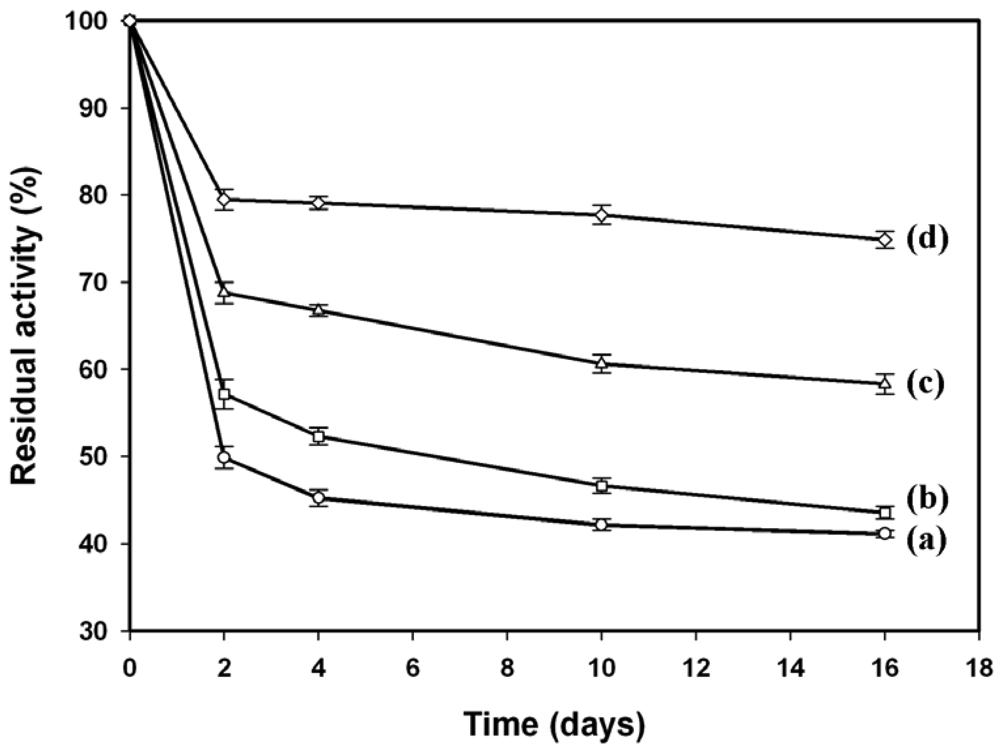 - Takahashi, H.; Li, B.; Sasaki, T.; Miyazaki, C.; Kajino, T.; Inagaki, S. Catalytic activity in organic solvents and stability of immobilized enzymes depend on the pore size and surface characteristics of mesoporous silica. Chem. Mater. 2000, 12, 3301–3305. [Google Scholar]