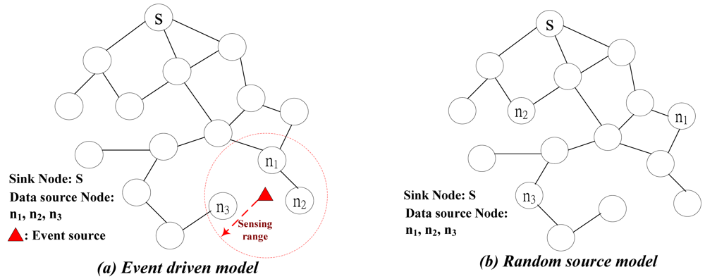 The application scenario described above is called event-driven that sensors are assigned to detect a particular event, which is shown in Figure 1(a). There are two other different applications of wireless sensor networks, which are namely periodic and query-based. These two applications could be classified as random-source, which is shown in Figure 1(b). Periodic scenario sensors probe environmental information periodically and report their measurements back to the sink node. All sensors in this kind of networks are necessitated to be synchronized such that all sensors sense information and report it simultaneously. Query-based scenario is applied to user-oriented applications. User can query information from certain area of sensors to require measurements that he is interested in. As can be seen in Figure 1(b), the data source nodes in random source model are not clustered as in event driven model.