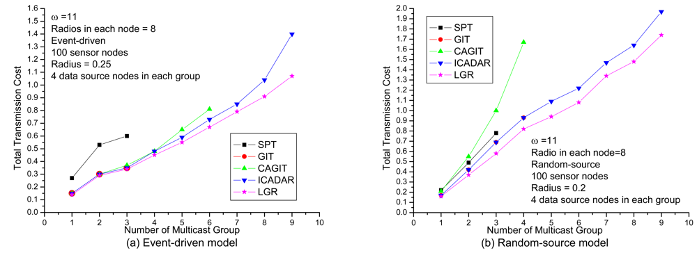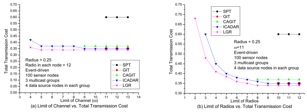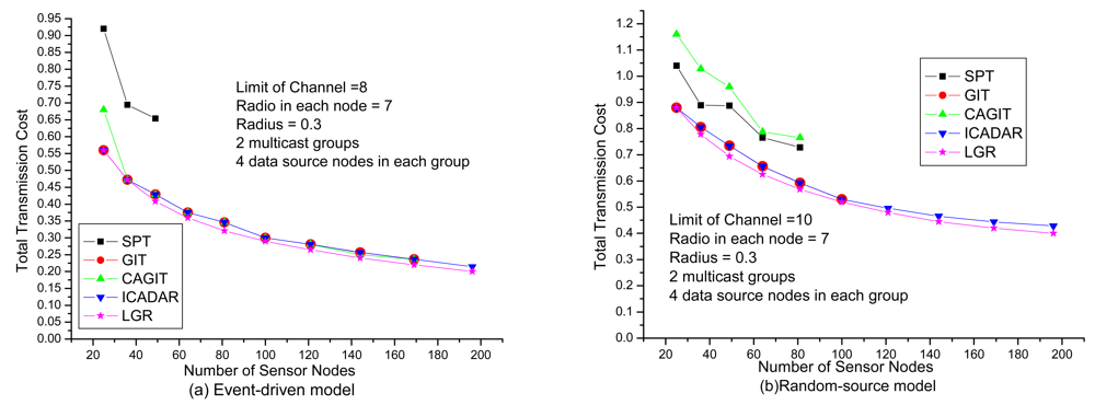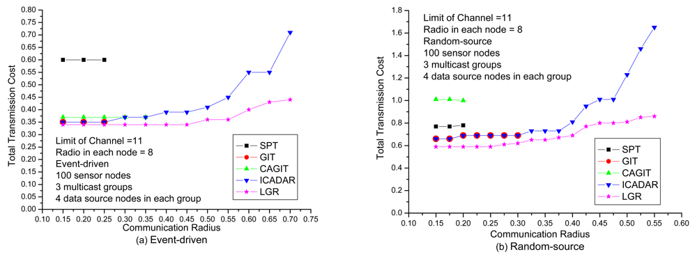 In Figure 11, it investigates the total transmission cost under different communication radius. It could be expected that with increasing the communication radius, it increases the probability of co-channel interference. Hence, it will be more difficult to identify the feasible channel assignment on the data aggregation tree. It might need to identify another routing path not to violate channel constraint (i.e., longer routing path that is out of the interference range of the other paths) under larger communication radius. We could observe that LGR algorithm outperforms the other heuristic algorithms in event-driven and random-source. As compared to ICADAR algorithm will rapidly increase the total transmission cost, we have more mild increase total transmission cost for LGR algorithm at large communication radius. This indicates that by incorporating penalty cost for violating the co-channel interference on the arc weight of each link, LGR could identify more cost efficient data aggregation tree to meet the co-channel interference under large communication radius.