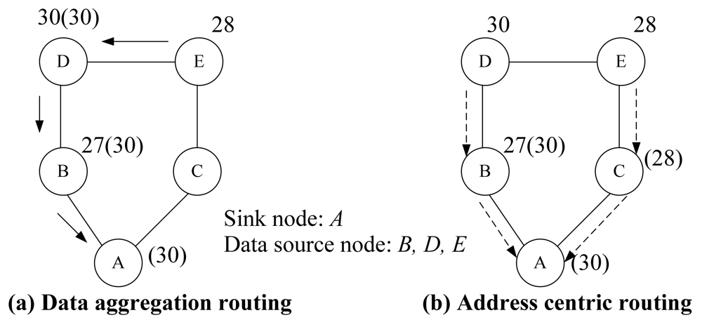 For data aggregation routing, raw data from multiple children sensor nodes are collected and processed before transmission. Data aggregation can minimize the number of transmission by eliminating redundant data from different source nodes [-]. Figure 2 gives an example of data aggregation routing and address centric routing where the maximum temperature is reported to a sink node. Label x(y) at each node represents the local temperature measurement is x while the aggregated (maximum) value so far is y. For example, at node 27(30), the maximum temperature up to now is MAX (27, 30) = 30. Assume the transmission cost on each link is equal to 1.0. In traditional address centric routing shown in Figure 2(b), each Origin-Destination (OD) pair follows the shortest path. Then the total cost for these three OD pairs is 4.0. However, with the capability of data aggregation at each sensor node, a more power efficient transmission is shown in Figure 2(a) via data aggregation routing where the total cost is 3.0.