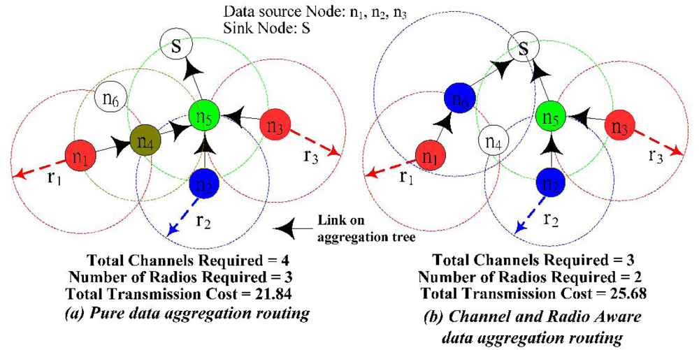 Besides limited number of available non-overlapping channels, number of radios on each sensor node is also a limited resource. If two children sensor nodes use two different channels transmit data back to the same sensor node, then this sensor node will need two radios to receive data simultaneously. Otherwise, it will incur larger latency for a single radio sensor node to switch different channel to receive from its children nodes. Hence, from the latency point of view, for any sensor node that is on the data aggregation tree, the number of radios equipped on this node must be greater than or equal to the number of children nodes. In Figure 3, I illustrate an example where the sensor nodes are randomly placed in a 15 × 15 area. In this example, the transmission cost is equal to the square of the Euclidean distance of the transmission radius. The sensor nodes with the same color are assigned with the same channel (e.g., n1 and n3). To prevent collision, any two sensor nodes that are within each other's transmission range could not assign the same channel (e.g., n2 and n5). In addition, even though n3 and n4 are not within each other's transmission range, n3 still could not reuse n4's channel because of n5. This is referred to as the hidden node problem. In this case, we say n3 and n4 are within each other's interference range. It is important to note that interference range is larger than the transmission range because of the hidden node problem. If every sensor node has the same transmission radius, then interference range is equal to the twice of transmission range in order to capture the co-channel interference from hidden nodes. In Figure 3(a), when the number of channels and radio is unlimited, the minimum total transmission cost is 21.84. The total number of channels required is 4 and the number of radios required for a node n5 is 3. If the total number of channels is limited to 3 or the number of radios on each node is limited to 2, then Figure 3(a) is not a feasible solution. In Figure 3(b), it shows the data aggregation tree for channel and radio aware data aggregation routing when the total number of channels is limited to be 3 and the number of radios on each sensor node is limited to 2. The transmission cost is 25.68, which is slightly larger than Figure 3(a).