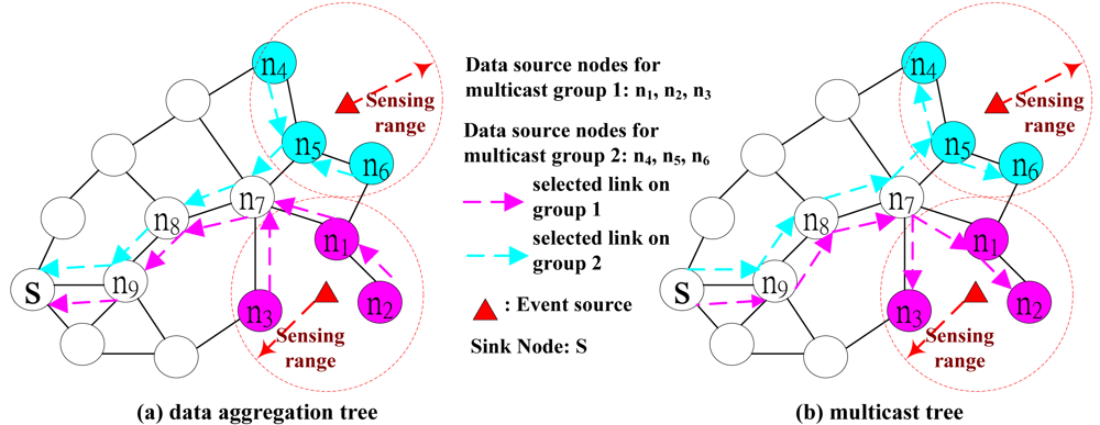 On the left hand side of Constraint (6), it calculates the number of paths that traverse over link l for each multicast group. This number is at most |Dg|. If there is a cycle on the union of the routing paths to every data source node and link l is on the cycle, then Constraint (6) will not be satisfied because there will be unlimited number of paths traversing over link l. Hence, Constraint (6) is to enforce that there will be no cycle on the union of the routing paths to every data source node. Constraints (7) and (8) enforce that the sink node selects exactly one routing path to every data source node. In addition, the objection function is to minimize the total transmission cost, so more than one incoming link traversing over a sensor node will incur larger cost. This guarantees that every sensor node has at most one incoming link. Hence, Constraints (6), (7) and (8) in conjunction with the objective function enforce the union of the routing path to every data source node of the multicast group shall be a tree. For example, in Figure 4, the multicast tree for multicast group 1 is the union of routing paths to three data source nodes (i.e. S→n9→n8→ n7→n1, S→n9→n8→ n7→n1→n2, S→n9→n8→ n7→n3).