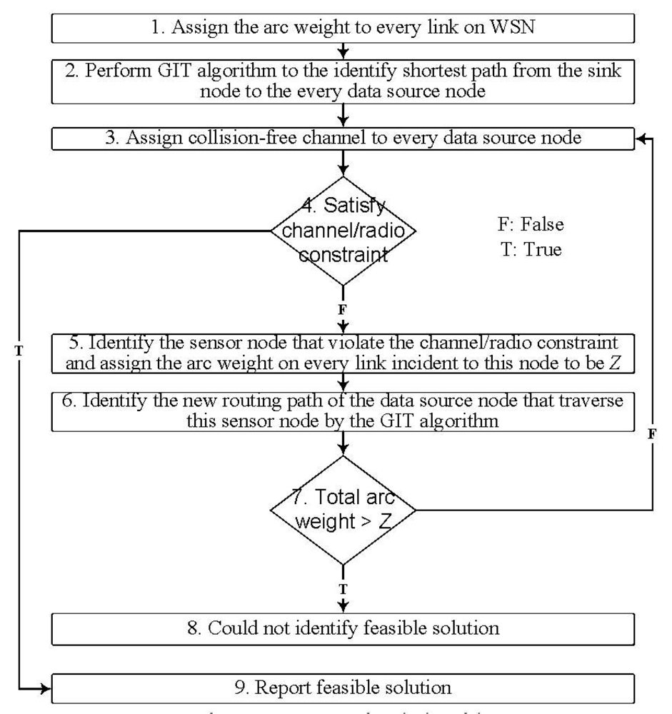 At Step 5, it specifies that if we could not assign feasible channel orradio to any sensor node along the routing path of the data source node, then we identify another routing path which bypasses the sensor nodes that violate the channel or radio constraint for this data source node. By assigning the very large arc weight (Z) to the links incident to these sensor nodes, the data source node could bypass these sensor nodes by running GIT algorithm again. If the total arc weight for the data source node exceeds Z, then we could conclude that there is no feasible channel/radio constrained routing path for this data source node. Note that, by assigning the very large arc weight (Z) to the links incident to the sensor nodes that violate the channel/radio constraint, the maximum number of traversed routing paths for any data source node is limited to be |N|-2, where |N|-2 represent the number of sensor nodes in the network besides the sink node and the data source node. In other words, at Step 7, the times of negative decision to go back to Step 3 is bounded to be |N|-2. Hence, we do not have an infinite looping problem.