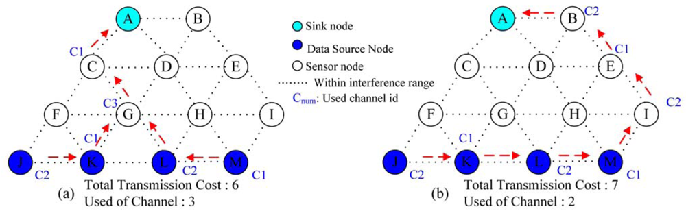 In [], they show how to minimize energy consumption by using the prioritized channel assignment and scheduling the listen and sleep time. Sensor nodes with less residual power are assigned with higher priority for channel assignment. Sensor nodes with low priority are scheduled to sleep to save energy loss. However, data aggregation routing is not addressed in []. In [], sensor networks are partitioned into clusters and each sensor node sends its data to its cluster head before transmitting outside the cluster. All inter-cluster communication is done by the cluster head. However, channel reuse for better channel utilization is not addressed in [].