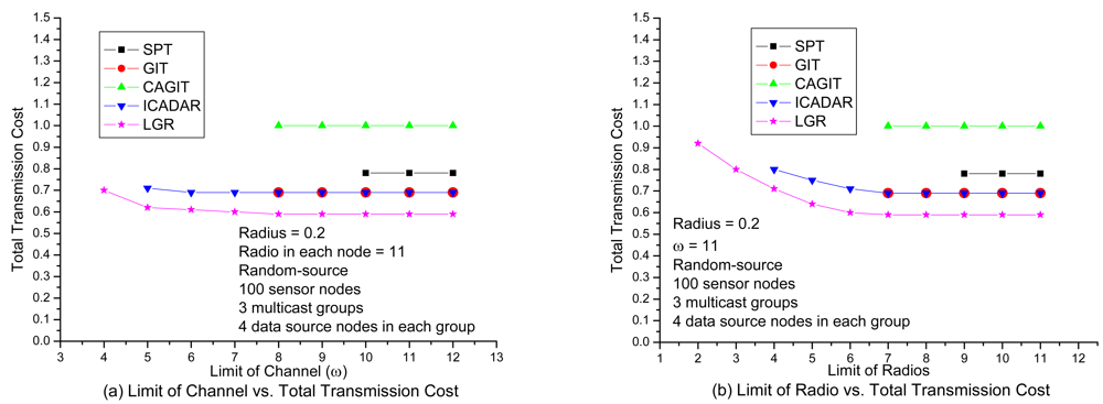 In Figure 8(a), it shows the transmission cost with respect to number of available channels under loose number of radios. It is expected that the total transmission cost will be increased at small available channels due to more stringent channel constraint. It is interesting to observe that, for SPT, GIT and CAGIT algorithms, the total transmission cost remains the same when ω is decreasing. It is because that they belong to an one shot algorithm, which will not alter its routing decision with respect to different ω. On the other hand, ICADAR and LGR algorithms could choose its routing decision not to aggregate under stringent channel constraint. Such kind of behavior is also observed in Figure 8(b). In addition, it is interesting to observe that stringent radio constraint incurs even significant increasing in transmission cost as compared to stringent channel constraint. It is because the maximum number of predecessor (i.e., incoming links) for each sensor node is limited by the number of radios on the sensor node. Then in stringent radio constraint, it results in longer data aggregation tree which makes it difficult to perform data aggregation. LGR algorithm is superior to the other four heuristics in both Figure 8(a) and Figure 8(b), and it is significant in stringent channel and radio constraint.