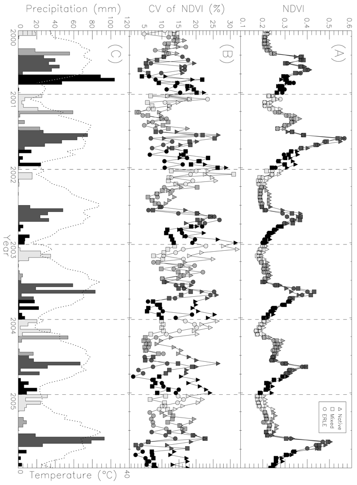 (A) The Normalized Difference Vegetation Index (NDVI) time-series data for Native, Mixed, and Eragrostis lehmanniana (ERLE) sites from 2000 to 2005. (B) Spatial variations of NDVI through time among sites demonstrated using the coefficient of variation (CV). (C) Bi-weekly precipitation (bars) and temperature (dotted line) data based upon daily weather records from five stations at the desert grasslands of southern Arizona, USA. Months are evenly divided by four intervals with colors from bright to dark. This figure is adapted from Huang et al. [45] with permission from Taylor & Francis.