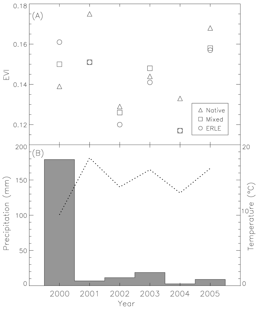 (A) The Enhanced Vegetation Index (EVI) in October (the Moderate Resolution Imaging Spectroradiometer [MODIS] period 19 and 20) of the extreme wet year (2000) and normal years (2001-2005) for field sites in a semi-arid environment of southern Arizona, USA across a gradient Eragrostis lehmanniana invasion (native grasslands [Native], a mixture of E. lehmanniana and native grasses [Mixed], E. lehmanniana invaded grasslands [ERLE]). (B) Mean October temperature (dashed line) and precipitation (gray bars) from 2000 to 2005 of the study region. This figure is adapted from Huang and Geiger [46] with permission from Wiley-Blackwell.