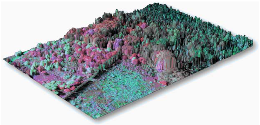 Demonstration of the precision co-alignment and integration of data collected by active (LiDAR) and passive (hyperspectral) remote sensing. This image was collected by the Carnegie Airborne Observatory over a site in Hawaii. The color-coding highlights variation among canopy species and their chemical properties both derived from the hyperspectral data. In this particular example, highly invasive species with unique chemical signatures are shown in red and pink colors, whereas native hardwood forest canopy species are shown in greens and blues. The embedded LiDAR data indicates the height and 3-D structure of each tree crown on the landscape.