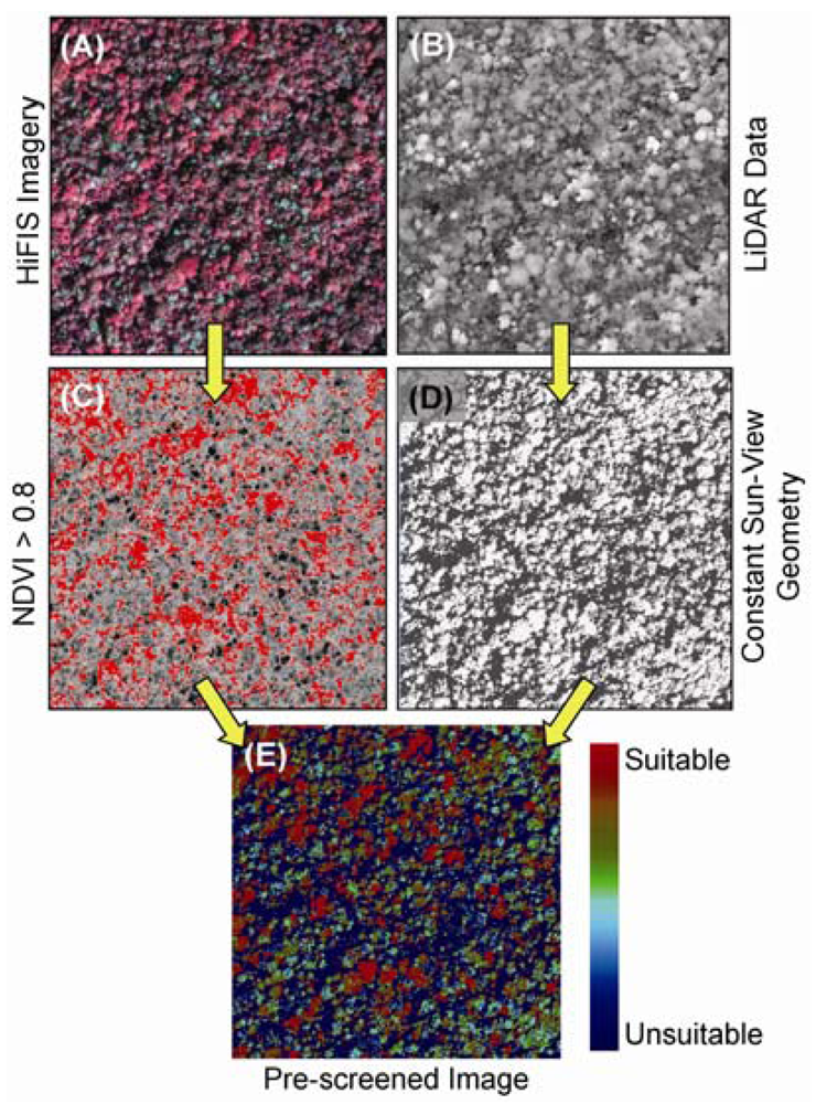 Fully integrated (A) hyperspectral and (B) LiDAR instrumentation provides a means to filter rainforest canopies into comparable units for mapping invasive species. (C) Simple pre-screening of the data based on a minimum NDVI, here set to 0.8, ensures that only foliated canopies are analyzed (red color). (D) Sun-target-view geometry (here, 20°) and minimum canopy height (here, 5 m) is controlled for using the LiDAR data thus pre-screening for view angle effects (white color). (E) Combined, these filters provide a map of canopies suitable for species determinations and comparison. These example images were collected over a Hawaiian rainforest reserve. Adapted from Asner and Martin [77] with permission from Elsevier.