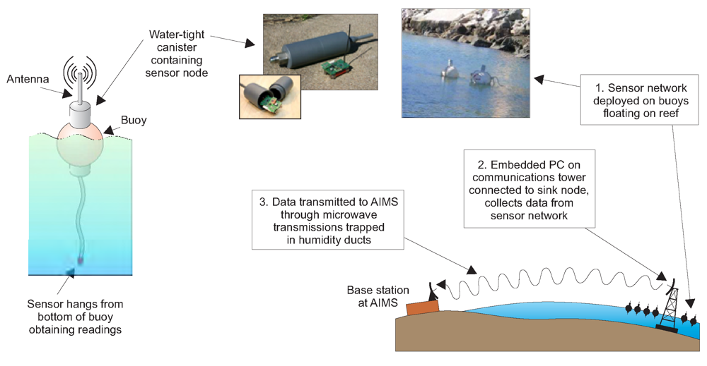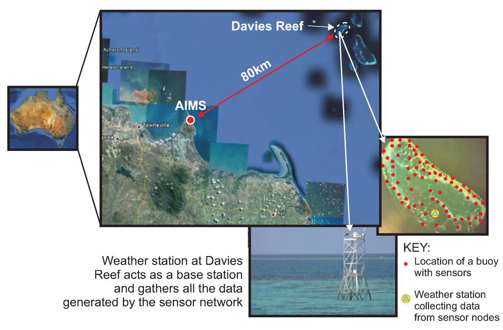 We are currently working together with the Australian Institute of Marine Science (AIMS) [] to set up a large-scale wireless sensor network to monitor various environmental parameters on the Great Barrier Reef (GBR) in Australia. Scientists at AIMS intend to use the collected data to study coral bleaching, reef-wide temperature fluctuations, impact of temperature on aquatic life and pollution.