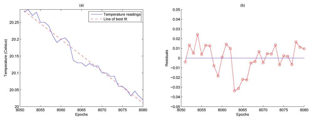 Eliminating the trend component from the sensor readings results in the residuals. This is shown in Figure 4(b). Note that the residuals have been obtained from the difference between the temperature sensor readings and the line of best fit illustrated in Figure 4(a). The residuals display two distinct characteristics. Firstly, there is no noticeable trend and secondly there are particular long stretches of residuals that have the same sign. This would be an unlikely occurrence if the residuals were observations of white noise with zero mean. This smoothness naturally indicates a certain level of dependence between readings []. The algorithm in this paper studies this dependence characteristic and uses it to help understand the behavior of the residuals so that predictions can be made.