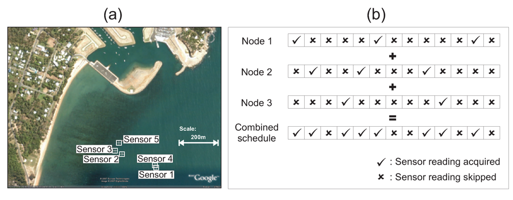 (a) Sensors deployed in Nelly Bay, Great Barrier Reef, Australia; (b) Combining schedules of adjacent nodes helps improve temporal coverage.