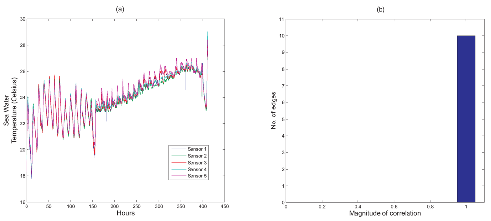 Figure 5 illustrates a deployment of five sensors in Nelly Bay in the Great Barrier Reef. As can be seen from the figure, the maximum distance between the sensors is around 350 m. We make the assumption that all sensors are within radio communication range of each other. This implies that the five sensors form a fully connected graph with a total of 10 edges. Note that each edge represents the correlation that exists between the two nodes at either end of the edge. Figure 6(a) shows the temperature readings collected from all the five sensors over a period of around 17 days.