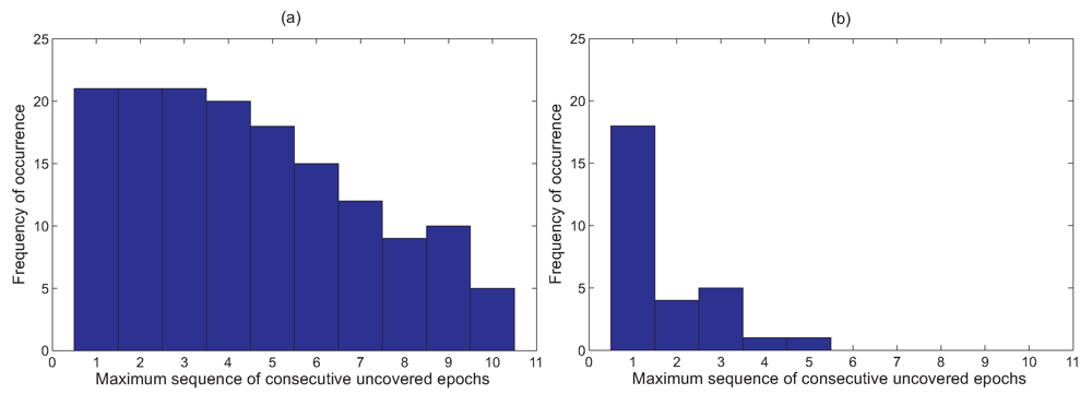 (a) Histogram showing spread of maximum sequence of consecutive uncovered epochs for AS algorithm; (b) Histogram showing maximum sequence of consecutive uncovered epochs when spatial correlations of adjacent nodes is considered.