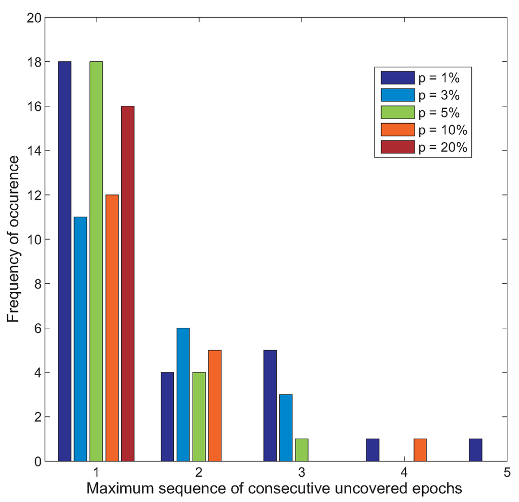 Histogram showing spread of maximum sequence of consecutive uncovered epochs when combining schedules of adjacent nodes using randomized scheme for different values of p.