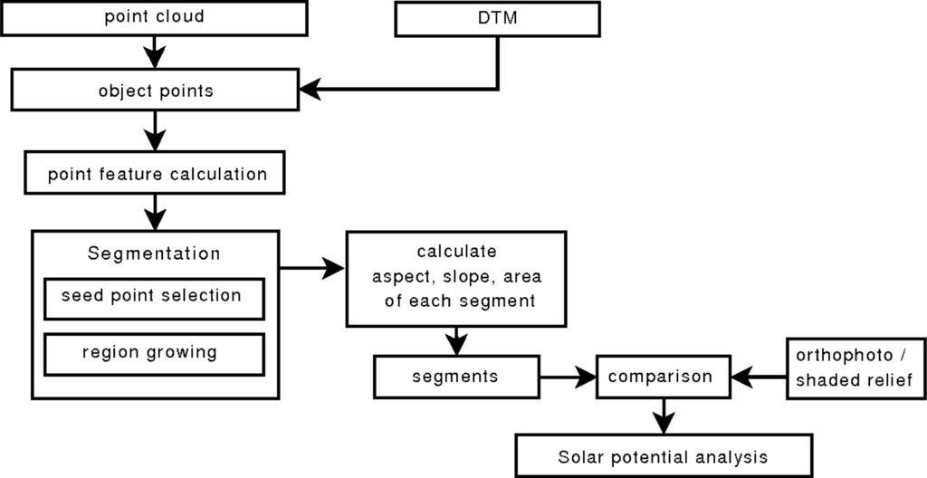 For building detection from ALS data, two successive steps are performed. First, the terrain points are separated from the object points [], and secondly the objects of interest are detected within the off-terrain points. By subtracting the terrain from the absolute point heights and removing points below a defined relative height threshold, the influence of the terrain and low objects such as small vegetation, cars, fences etc. are eliminated. The calculation of point features such as its normal vector and surface roughness, followed by a seed point selection and region growing process are applied to detect the roof planes in the 3D point cloud. To determine the solar radiation of each roof segment, its inclination, aspect and area are calculated. Error assessment based on orthophotos and a shaded relief is performed to estimate the accuracy of the roof detection process. The proposed workflow is shown in Figure 1.