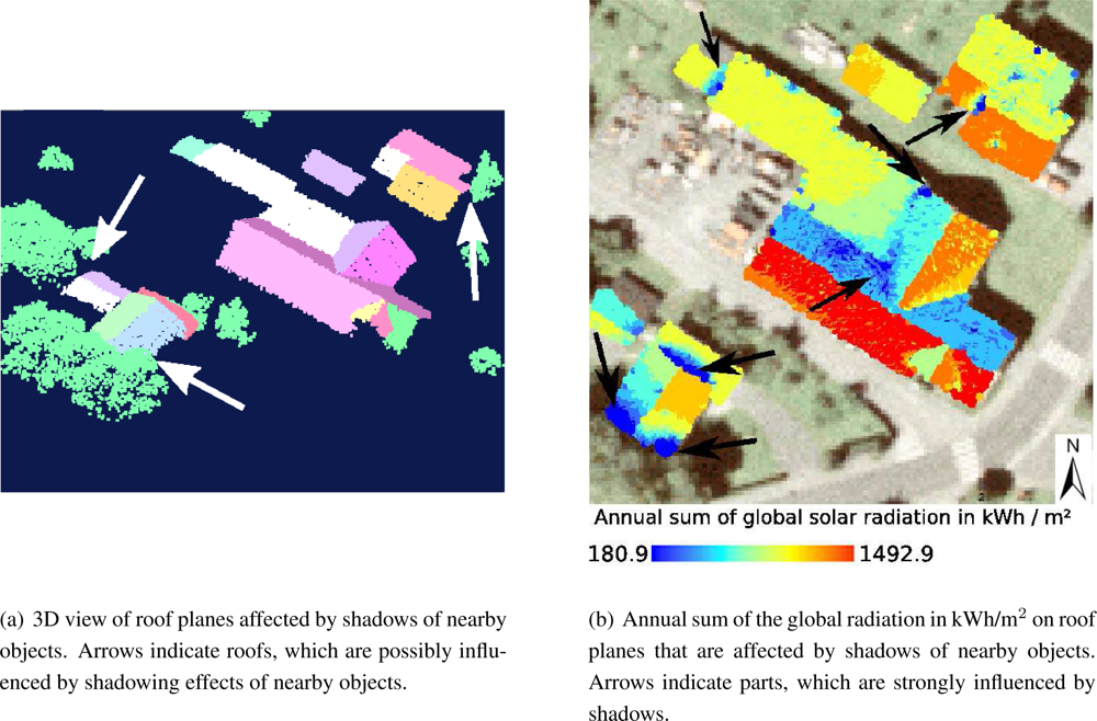 This approach allows the detection of suitable roof planes in a fast, accurate and cost effective way. In particular areas which are strongly affected by shadows can be excluded from a potential suitable areas list quickly. Detailed plannings including determination of the optimal inclination angle of solar panels and the available area are required for each building, which seems to be suitable for the installation of such devices.