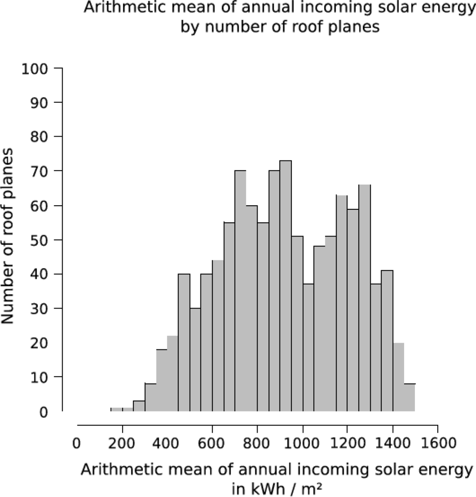 Arithmetic mean of annual incoming solar energy by number of roof planes. 75.5% of detected roof planes receive more than 700 kWh/m2 of solar energy.