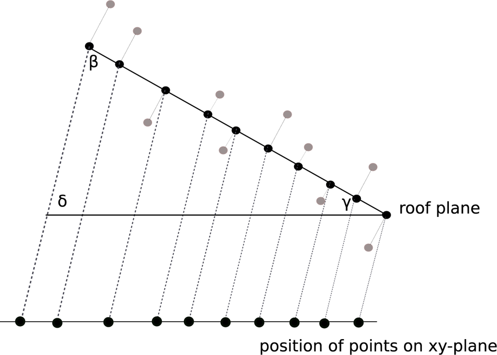 The projection of each point lying on a roof plane on the xy-plane. The dashed line is determined by the inclination angle γ of each roof segment. For simplicity the figure is shown in 2D profile.
