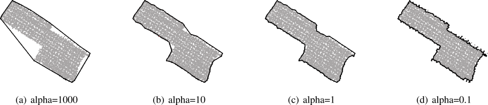 Segment boundary derived by alpha shapes for different values of α. For large values of α the convex hull is obtained (a), whereas small values lead to outlines with artifacts caused by the random point distribution (d).