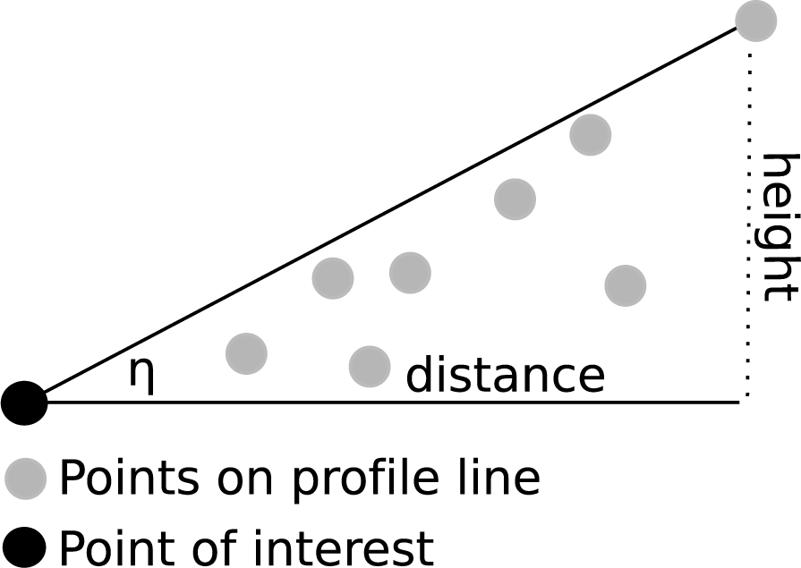 The ratio between distance and difference in height determines the angle η. The maximum angle within the profile line is equal to the minimum solar elevation angle that is needed to have a line of sight between the point of interest and the sun i.e. the point is not within a shaded area. Once the angle η is determined, the line is rotated clockwise in defined degree increments and the horizon is calculated for the current direction. This step is repeated until the line reaches the annual maximum solar azimuth angle.