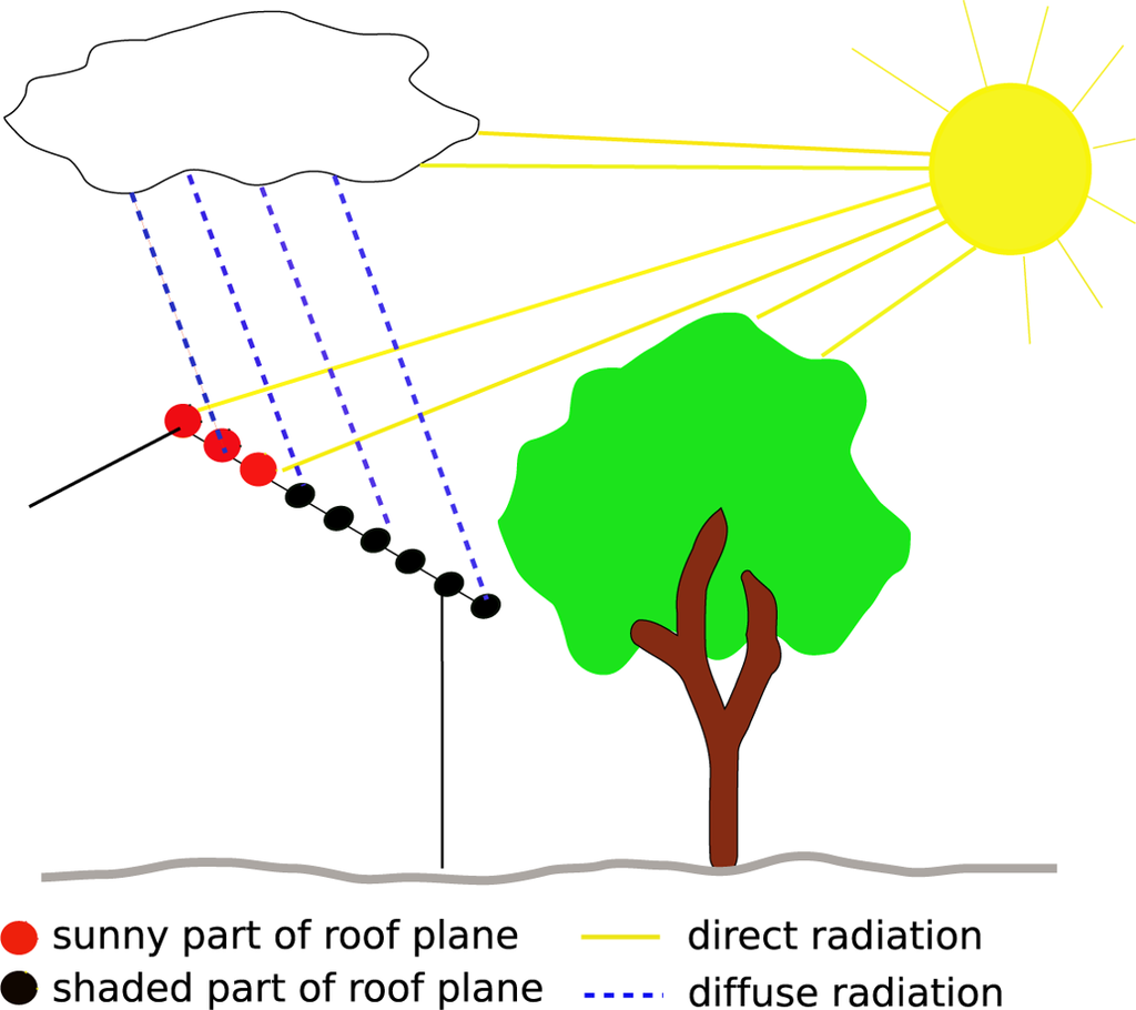 The direct radiation on the roof plane is influenced by a nearby tree. Not all parts of the roof facet receive solar energy. Once a point is in the shade of an object, its direct radiation is set to zero and only the diffuse component is considered.