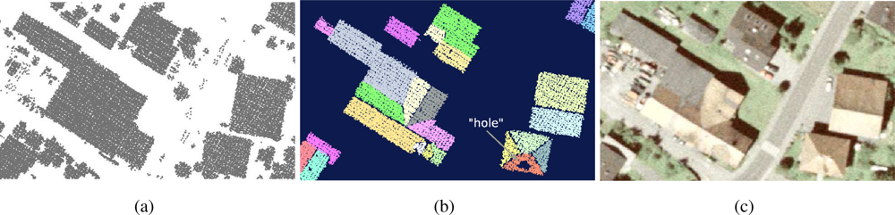 Roof face extraction, a) selected object points showing vegetation, roofs and other objects, b) roof points detected by region growing, c) orthophoto for comparison.