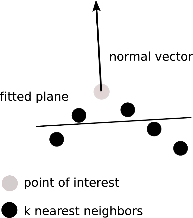 In contrast to other high objects detected by an ALS, like vegetation, roofs are composed of one or more planar parts, i.e. roof planes, dependent on the roof type. Thus, points belonging to the same planar region must have similar normal vectors, which can be estimated by fitting an orthogonal regression plane to each point and its k nearest neighbors []. The surface roughness, defined as the standard deviation of the orthogonal fitting residuals [], is used as an additional feature to verify local planarity of a point.